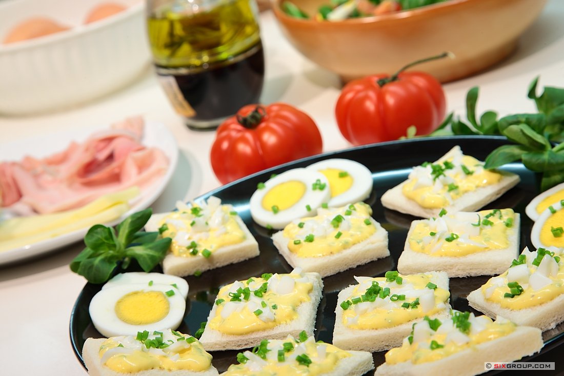 Brot mit Eiercreme bestreichen und mit den Eiweißwürfeln bestreuen.