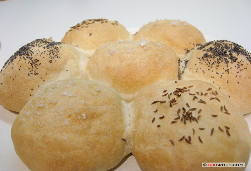 Backofen auf 190°C vorheizen. Eigelb mit etwas Wasser verrühren, Oberfläche damit bestreichen. Mit Mohn, grobem Salz, Sesam, Kümmel usw. bestreuen.