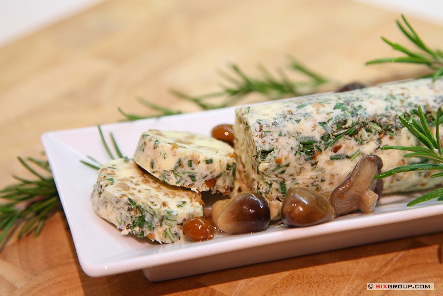 Butter schaumig schlagen, Pilze und Rosmarin unterheben. Abschmecken, formen und kalt stellen.