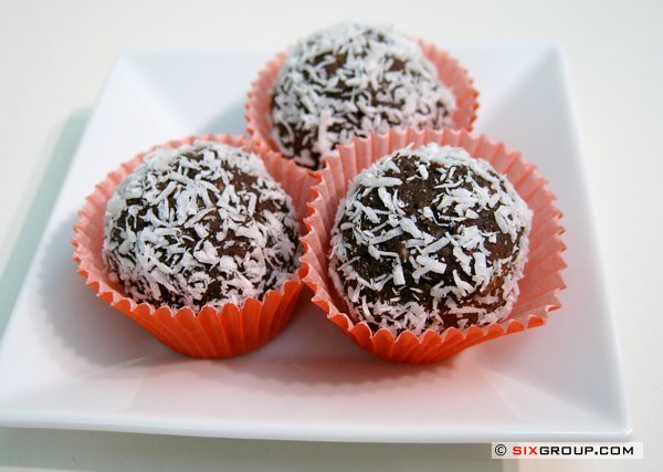 Kleine Kugeln formen und diese in Schokoladestreusel, geriebener weißer Schokolade oder Kokosflocken wälzen.