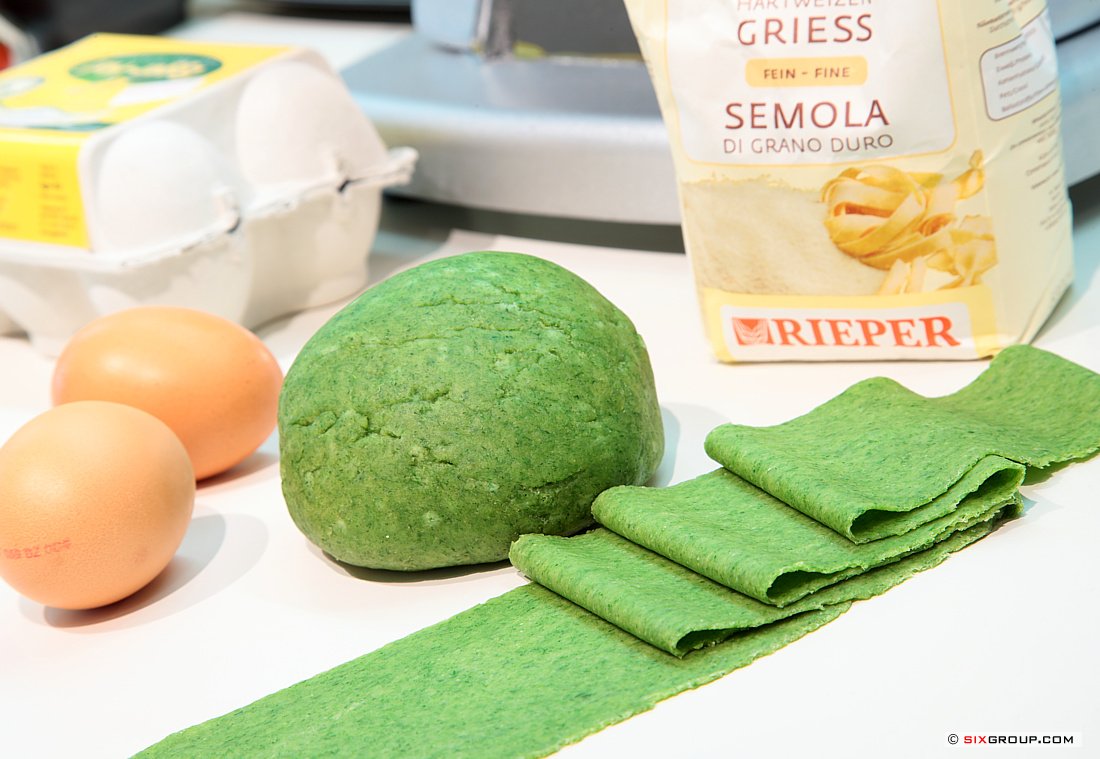 Weizen- und Hartweizenmehl in eine Schüssel geben und mit dem Ei, dem Spinatpüree, dem Olivenöl und Salz vermischen. Auf dem Tisch oder Nudelbrett zu einem geschmeidigen, aber doch relativ festen Teig kneten. In Klarsichtsfolie wickeln und ca. 30Min. ruhen lassen.